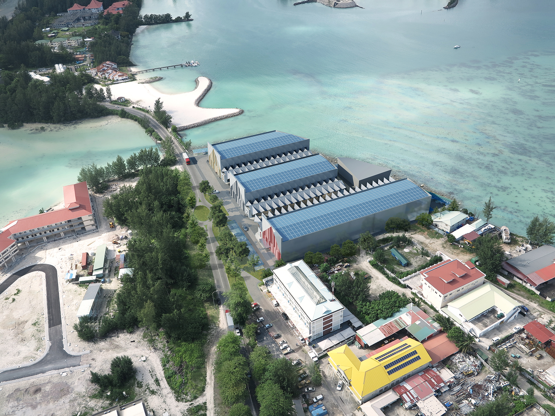 Facing the Indian Ocean, and on the main highway connecting north to south, sea and air ports, the site is well-situated to distribute to the capital, all of Mahé, and nearby islands.